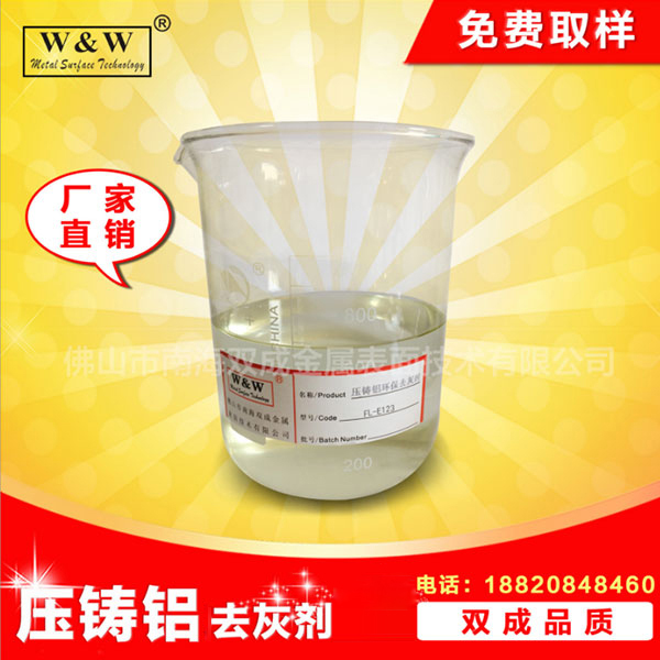 本產(chǎn)品是一種壓鑄鋁專用的去灰劑:能有效去除鑄鋁件表面的污漬(譬如:經(jīng)化學拋光,堿腐蝕后產(chǎn)??生的黑灰,)獲得清潔光亮的表面;易清洗,不污染 后續(xù)處理;完全不含傳統(tǒng)的三酸(硝酸、磷酸,氫氟酸),環(huán)保。